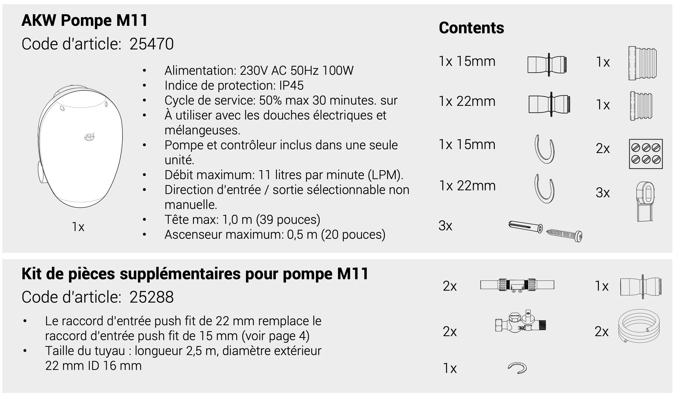 Vérifiez que vous avez toutes les bonnes pièces requises. Assurez-vous que le volume d’eau de la douche ne dépasse pas la capacité de drainage de la pompe.