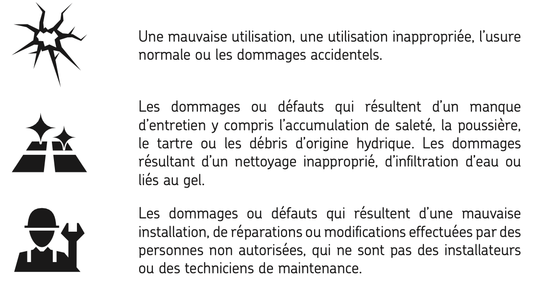 * La garantie couvre uniquement les défauts matériels ou de fabrication et ne concerne pas :