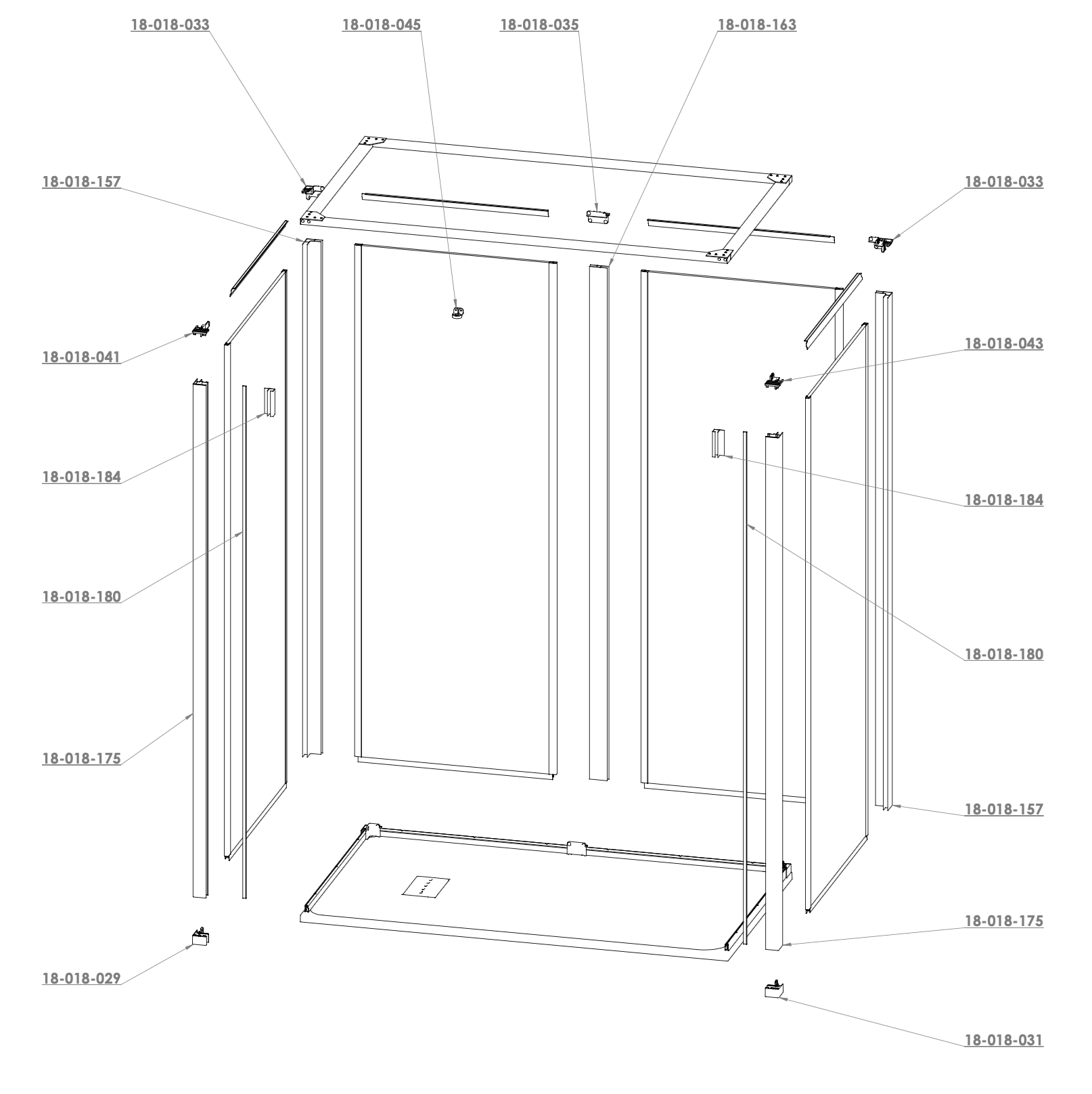 Vue éclatée espace de douche Onyx toute porte sauf LevelBest avec segment pivotant